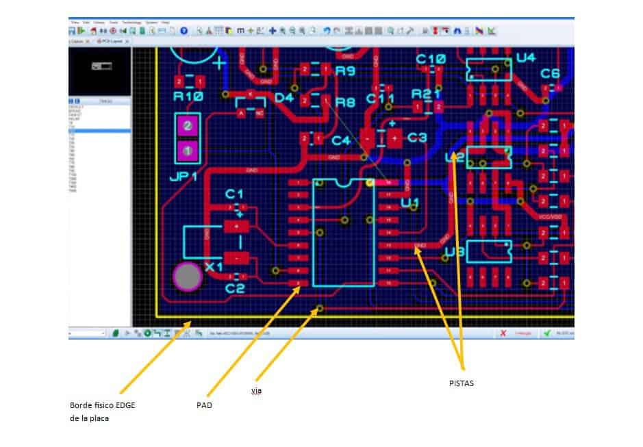 Las pistas son los caminitos por donde circula la corriente, en lugar de ser cables son líneas de cobre que unen patillas entre componentes, en este caso en el programa proteus vemos como hay de color rojo y azul, eso indica que es una placa de circuito impreso de doble cara es decir hay pistas a ambos lados de la baquelita debido a que por la complejidad y tamaño reducido del pcb para evitar que se me crucen unas pistas con otras lo que hago pasarme a la otra cara continuar por esta y luego volver a la cara anterior si fuera necesario.