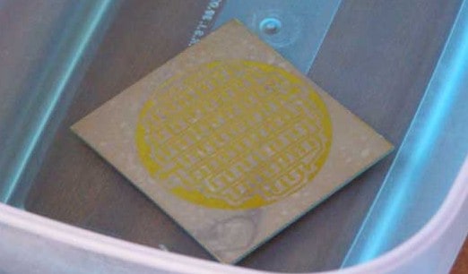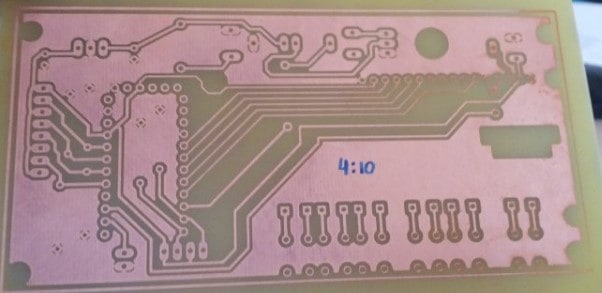 Una vez ya hemos conseguido que se grabe el dibujo de nuestro circuito electrónico ,ahora toca el revelado con el que tendremos que eliminar los restos de película fotosensible como se ve en la imagen lo más clarito diferente a las pistas.
