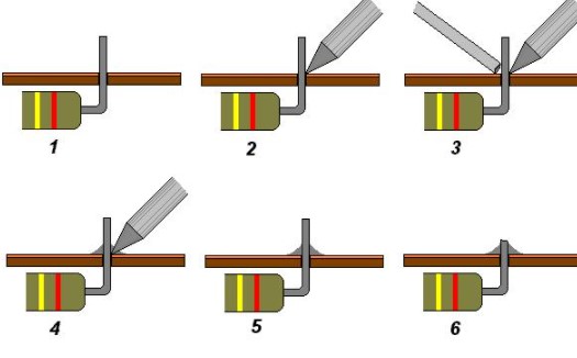 Con el soldador ya caliente, calentamos ambas partes a unir dejando el soldador quieto en dicha parte pasados unos segundos aplicaremos el estaño moviendo este y el soldador hasta cubrir la zona a unir.