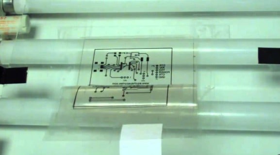 Pasado un tiempo que va ha depender del fabricante de la placa y de la potencia de tu insoladora, se quedara grabado el dibujo del circuito de la transparencia en tu placa baquelita, si no conoces estos tiempos te tocará hacer pruebas con pequeños trocitos de baquelita más transparencia, poniéndolos a insolar y observando los resultados, es muy importante que una vez cierres la insoladora no entre luz por ningún sitio así que asegúrate de poner goma espuma o algo similar para evitar que se cuele luz del exterior.