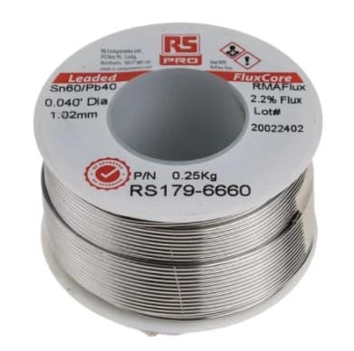 Algunos rollos de estaño como el de la imagen incorporan un componente que se llama flux cuya misión es la de facilitar que se adhiera el estaño a la las partes a soldar, el flux también se puede comprar a parte viene en un botecito pequeño cuyo tapón es un pincel para facilitar su aplicación
