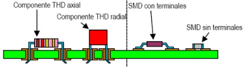 Por otro lado tenemos componentes o conectores de inserción THD para los que si tendremos que taladrar para poder colocarlos en el pcb de nuestro circuito electrónico