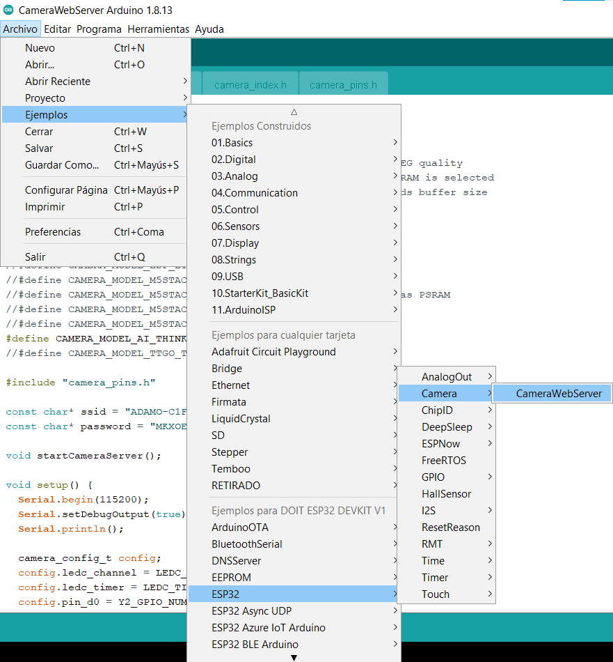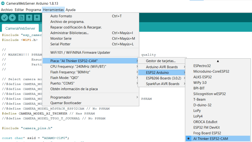 Lo primero que hay que descomentar la línea del modelo, para la placa que yo tengo me ha ido bien descomentar CAMERA_MODEL_AI_THINKER, también hay que rellenar las líneas ssid y password de tu red wifi.