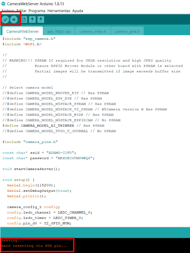 Con la Esp32CAM conectada pulsaremos en la flechita para subir el programa en ese momento se comenzará a conectar con la placa y comenzara a mostrarse el porcentaje de subida, una vez llegado al 100% nos dará el mensaje de la imagen Hard reseting via rts pin.
