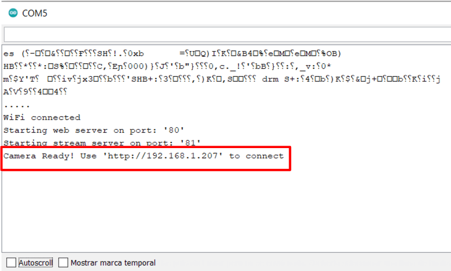 Abrimos el monitor serie que nos aparece al situado en el icono de la lupa en el vértice superior derecho del IDE de Arduino y pulsando el botón de reset de la ESP32CAM nos aparecerá la ip que se le ha dado a la cámara.