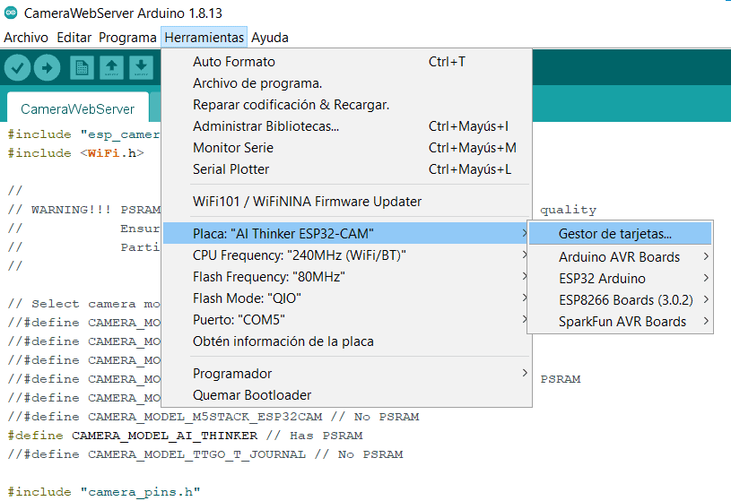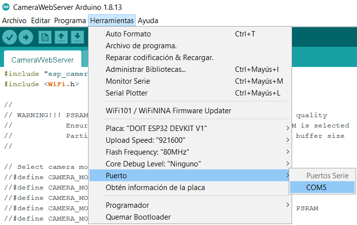 Es importante anotar el puerto COM donde tenemos conectado nuestra ESP32CAM en este caso el COM5