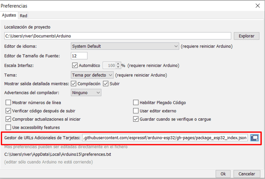 Lo primero es abrir el IDE de Arduino e ingresar al gestor urls de tarjetas pulsando en Archivo/Preferencias/Gestor de URLs adicionales de tarjetas y añado el siguiente enlace: