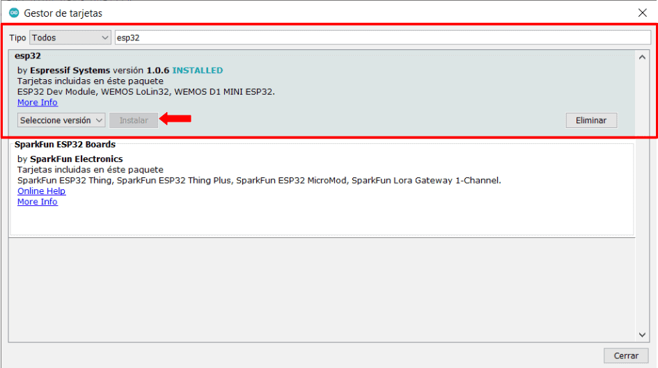 Para ello ingresaremos en Herramientas/Placas/Gestor de tarjetas y escribiremos ESP32