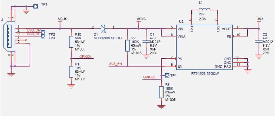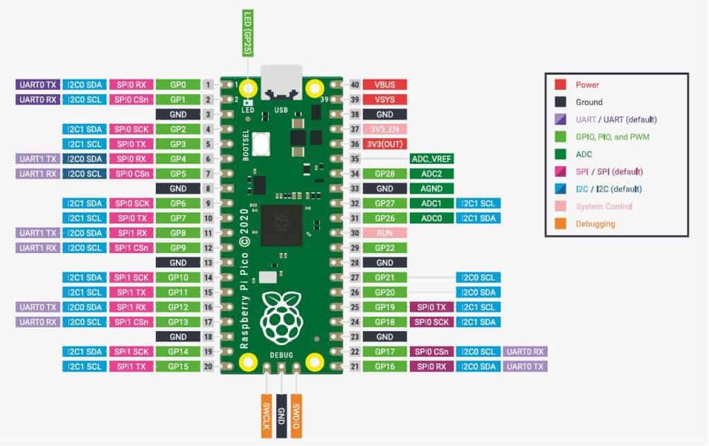 39. VSYS pin para alimentar con una fuente o a batería externa de entre 1.8v y 5.5v no alimentar a la vez por pin nº40 y nº39, también se comporta como tensión de salida cuando alimentamos desde el puerto Usb recuerda que habra una pequeña caida de tensión de décimas de voltio en el diodo Schottky, este diodo es para proteger de inversiones de polaridad.